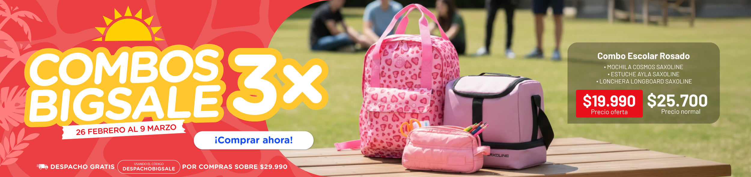 Combo Saxoline 3x: Mochila Cosmos Rosados + Estuche Ayla Rosado + Lonchera Longboard Rosa Viejo