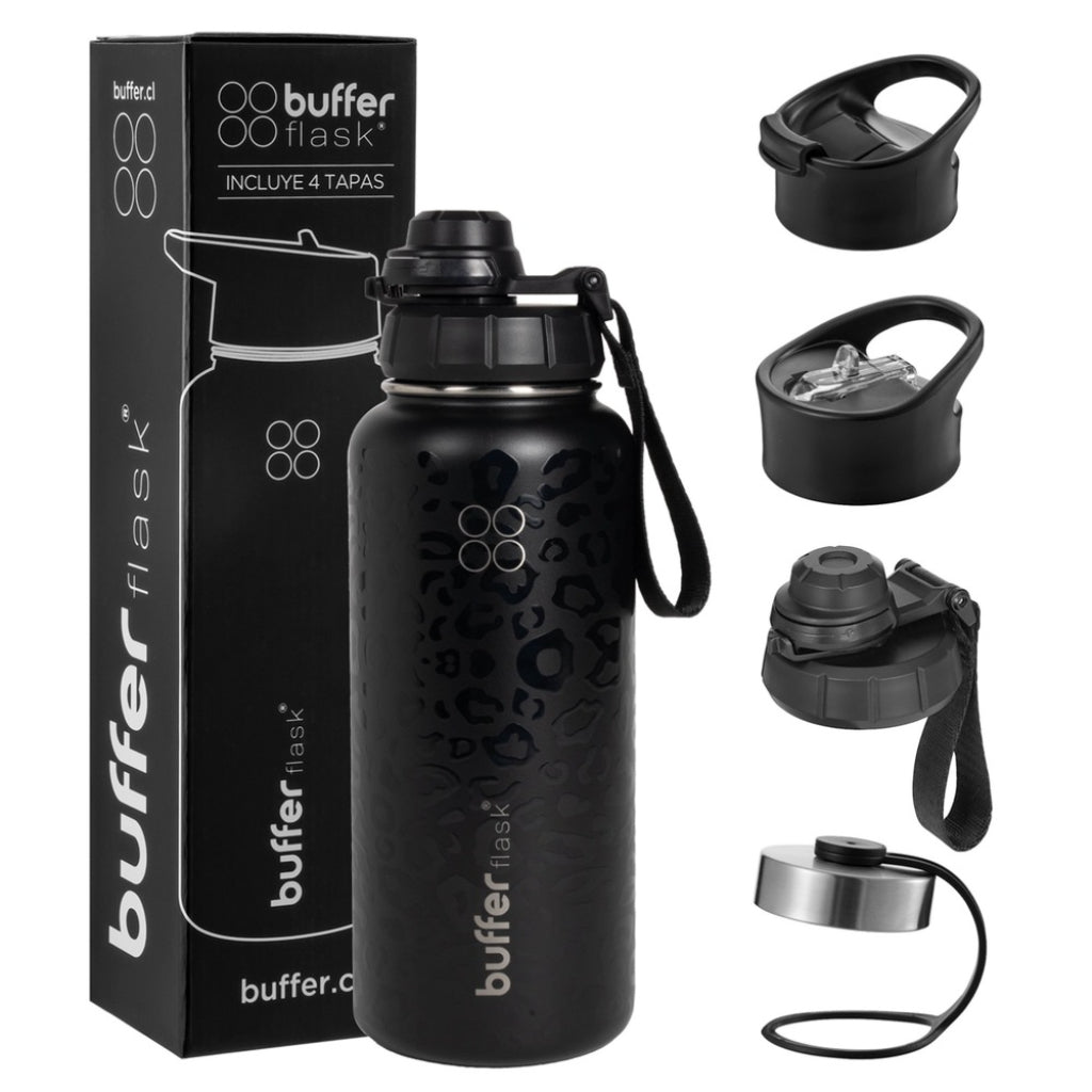 Botella Agua Térmica Buffer Morea 950ml +4 Tapas Negro Leopardo