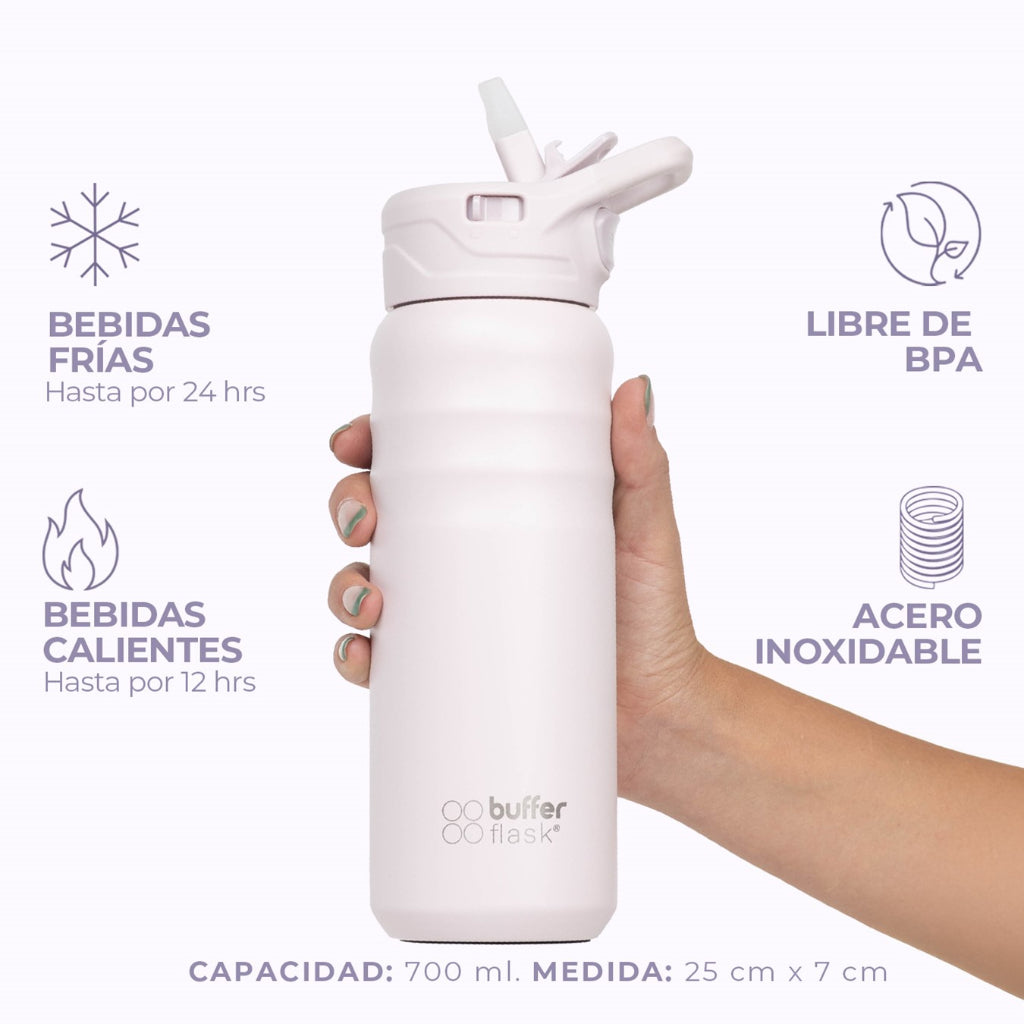 ¡Comodidad, seguridad e hidratación ante todo! La botella térmica Buffer de 700 ml te permitirá mantenerte hidratado durante más tiempo, sin perder su temperatura, diseñada pensando en tu comodidad, incluye tapa con bombilla y seguro anti derrames.