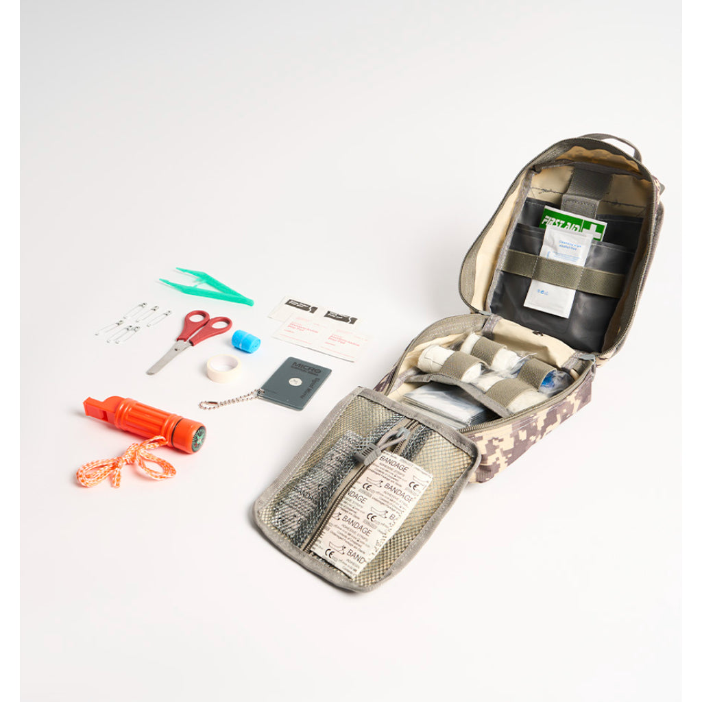 El botiquín Llaima Militar combina portabilidad, resistencia y eficiencia. Su diseño compacto permite llevarlo fácilmente en mochila o cinturón, sin sacrificar contenido. Fabricado con tela Canvas antidesgarro, soporta condiciones exigentes. Cada compartimento está pensado para acceder rápidamente a los elementos, permitiendo una atención eficaz ante cortes, torceduras y lesiones menores.