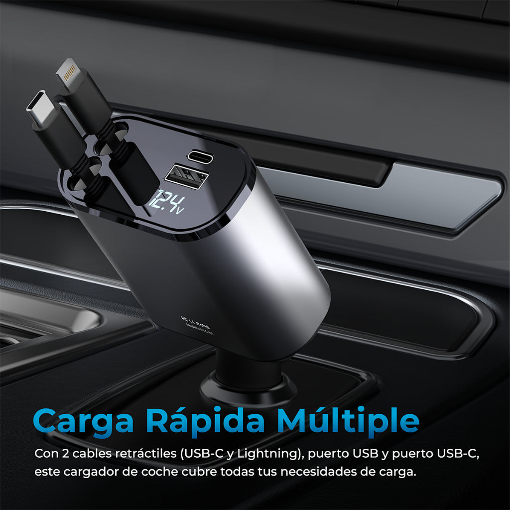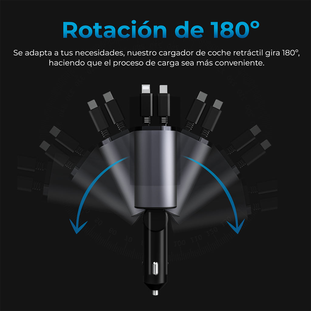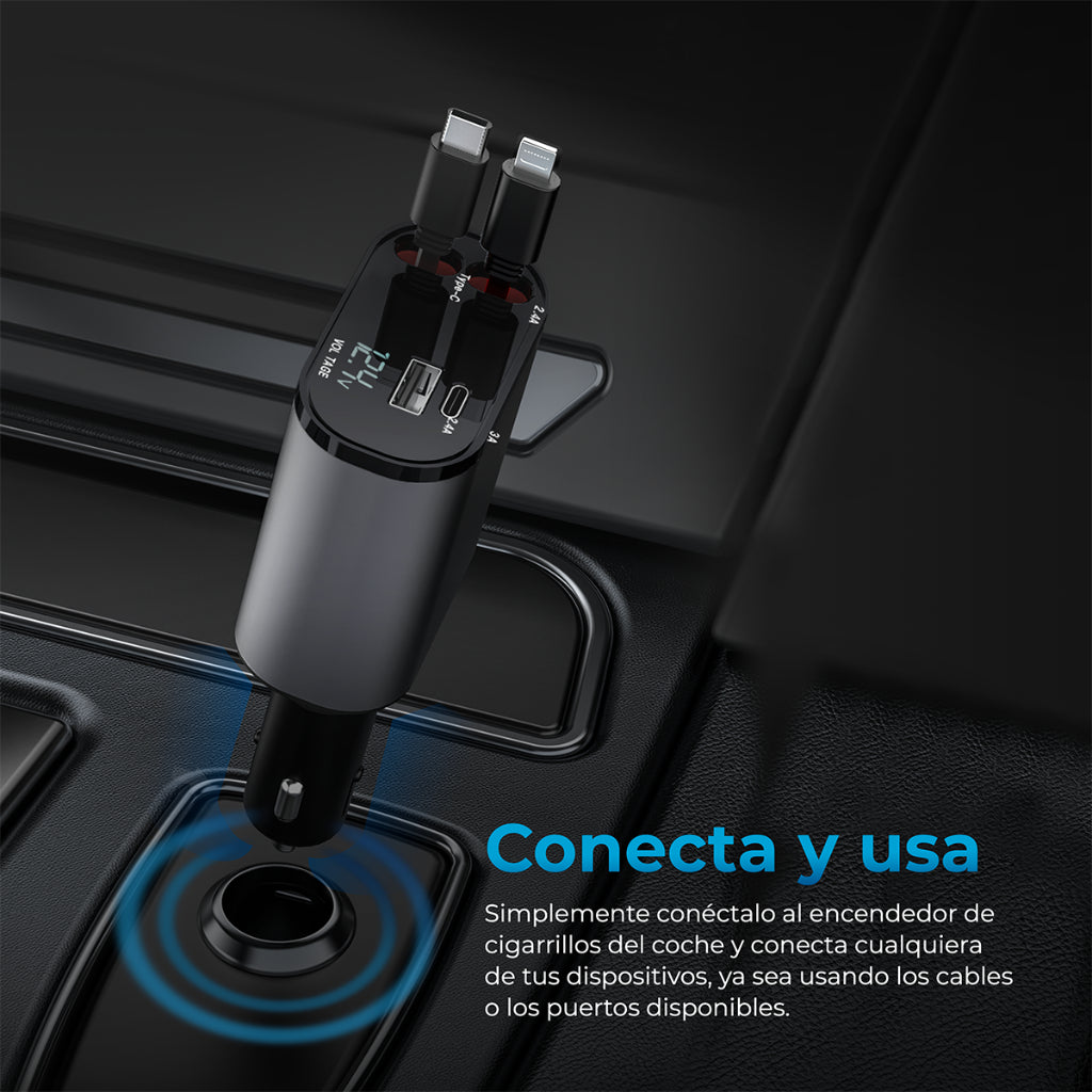 Adiós al caos de cables. El Cargador Retráctil 4 en 1 ARCC-101 de Autosky transforma tu auto en una estación de carga inteligente y ordenada. Cables retráctiles que se extienden cuando los necesitas y desaparecen cuando no, manteniendo tu vehículo impecable.