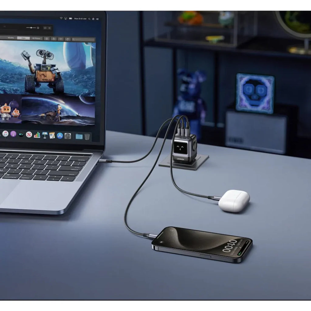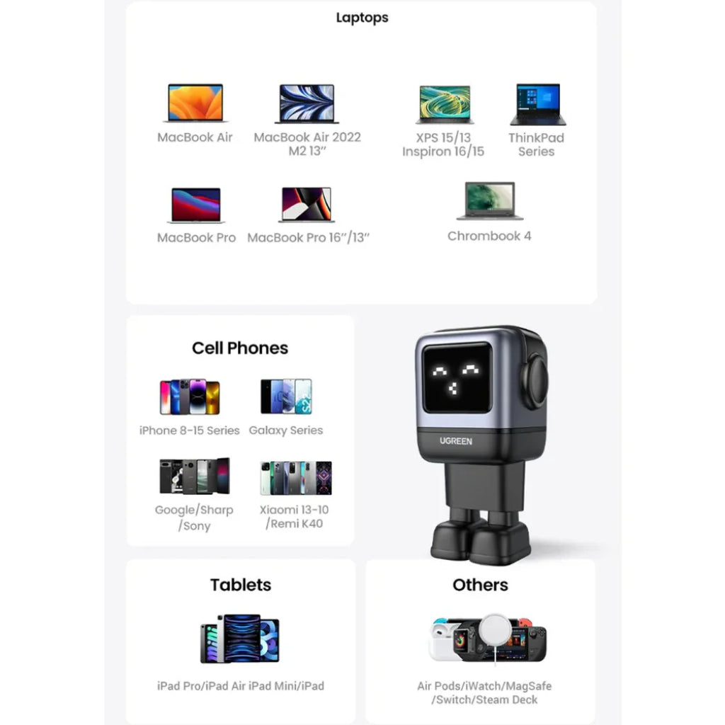 ¡Tecnología y diseño que cobran vida! El Cargador Robot UGREEN Nexode 65W combina potencia y estilo futurista para mantener todos tus dispositivos cargados al máximo. Con 2 puertos USB-C y 1 USB-A, ofrece carga simultánea para smartphones, tablets y laptops gracias a la eficiencia de la tecnología GaN. Su pantalla LED y diseño innovador lo convierten en un accesorio tan funcional como llamativo.
