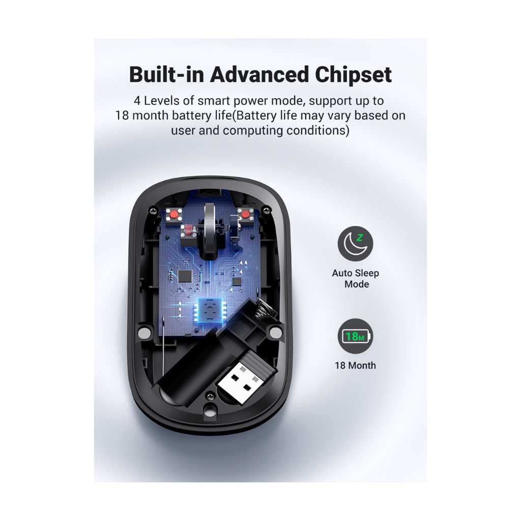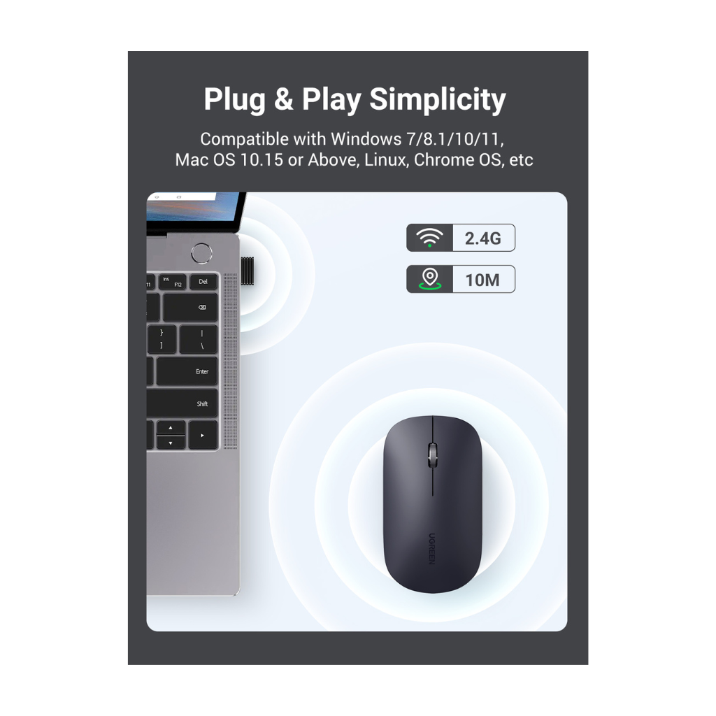 El Mouse Inalámbrico Ultra-Slim UGREEN MU001 combina comodidad, precisión y silencio en un diseño elegante de solo 3 cm de grosor. Su tecnología inalámbrica 2.4 GHz ofrece una conexión estable con un alcance de hasta 10 metros, permitiéndote trabajar, estudiar o jugar con total libertad.