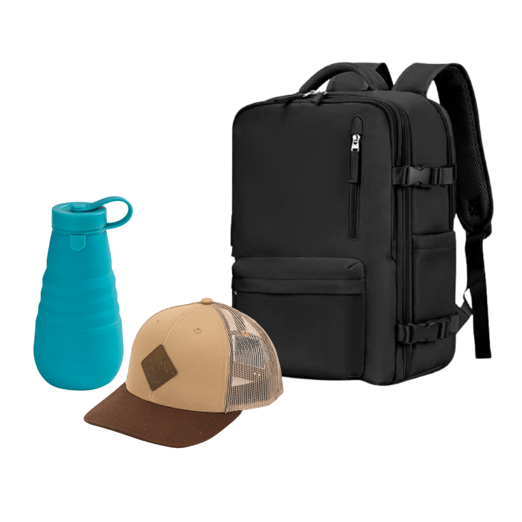 Combo 49% OFF: Mochila Viaje Viral (Cabina Avión) 31L Black. + Jockey Llaima Maipo Beige + Botella Silicona Plegable Azul