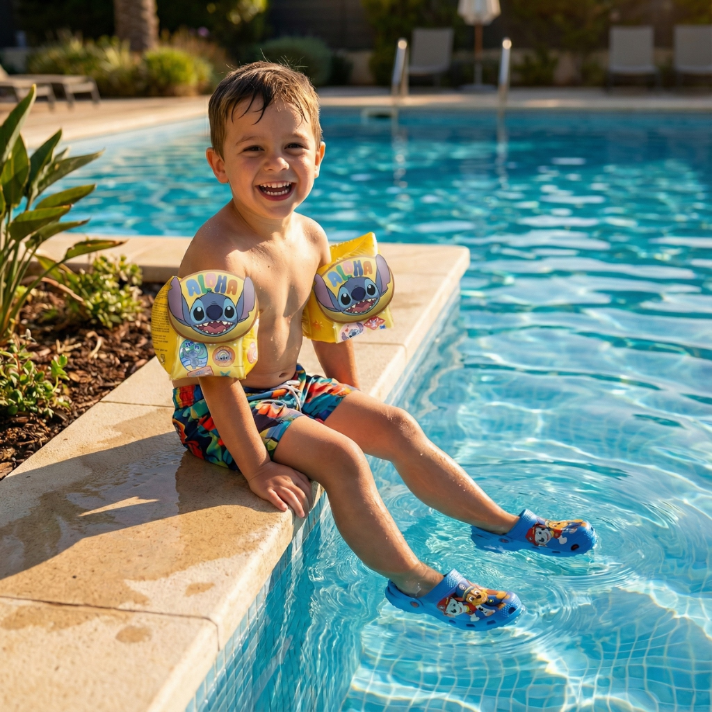 Combo Sandalia Zueco Niño Paw Patrol Azul y Alitas Flotadoras Niños 3D StitchDescripción