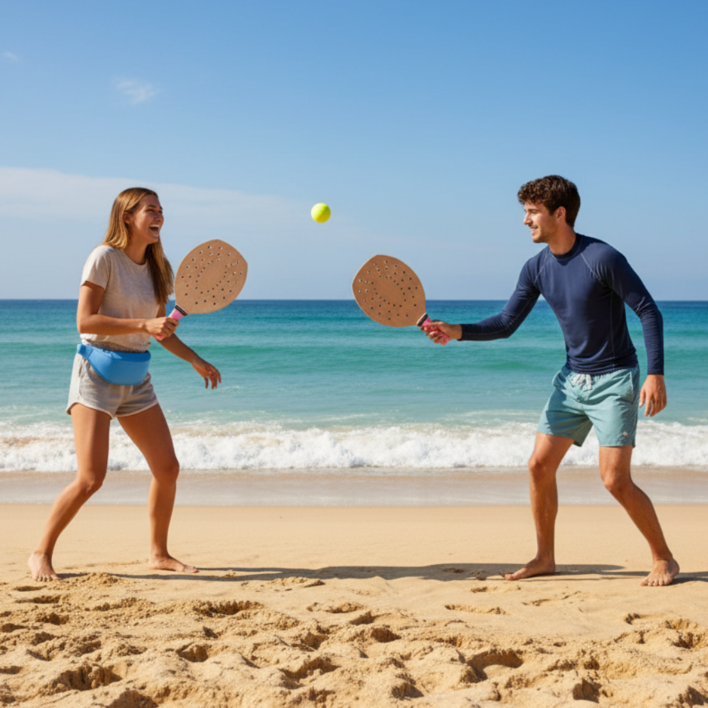 Cada set incluye 2 paletas de terciado marino de 12 mm de espesor, 1 pelota de tenis y 1 bolso estampado de lona y malla para transportar fácilmente.
