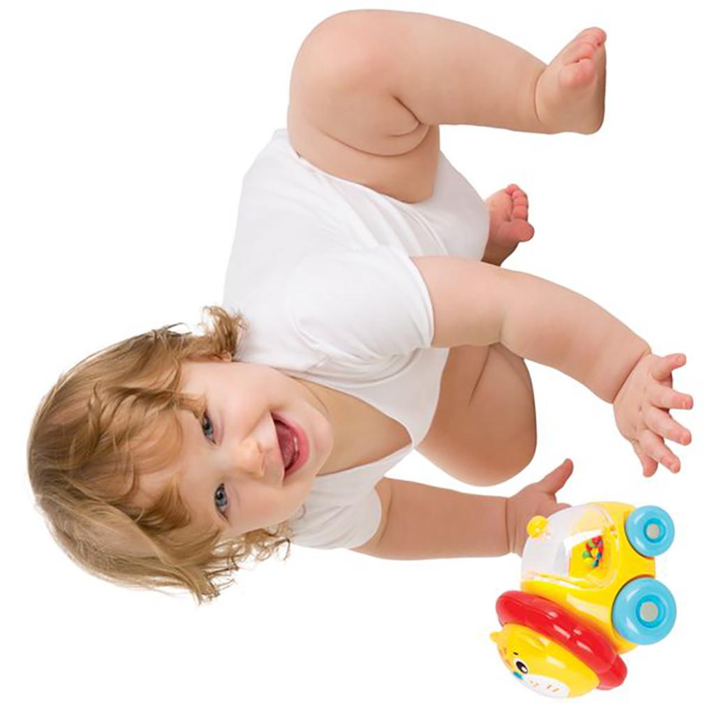 Sus colores llamativos favorecen la estimulación visual, mientras que los ojos en blanco y negro ayudan a mejorar el seguimiento visual durante el desplazamiento. Al rodar, el sonajero emite agradables sonidos de traqueteo que captan la atención del bebé y refuerzan la estimulación auditiva. El diseño de empuje permite fortalecer la motricidad gruesa, incentivando el movimiento y la coordinación.