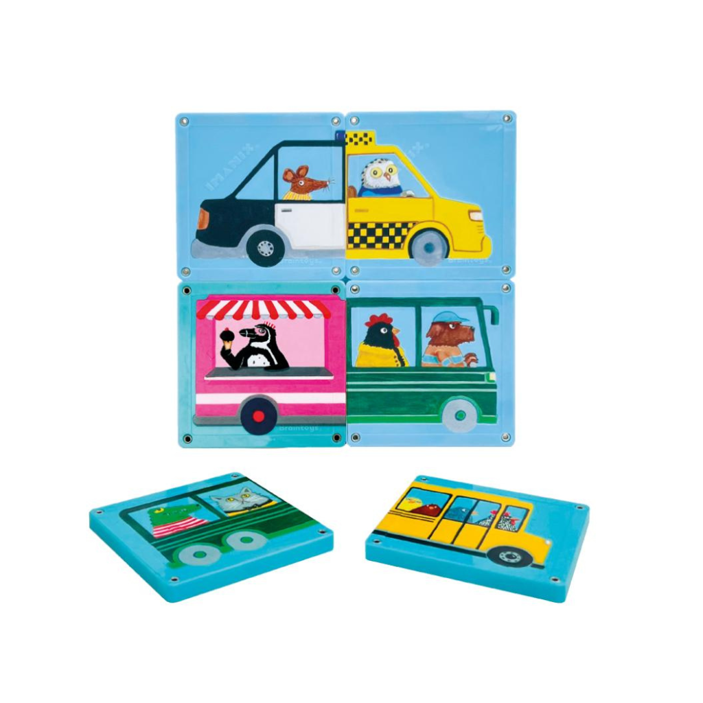 Los niños pueden unir, mezclar y combinar las piezas para crear infinitas escenas: ¿un auto con carro de helados?, ¿un bus conducido por un animal?, ¿un camión de reciclaje lleno de aventuras? Cada combinación abre la puerta a nuevas historias.