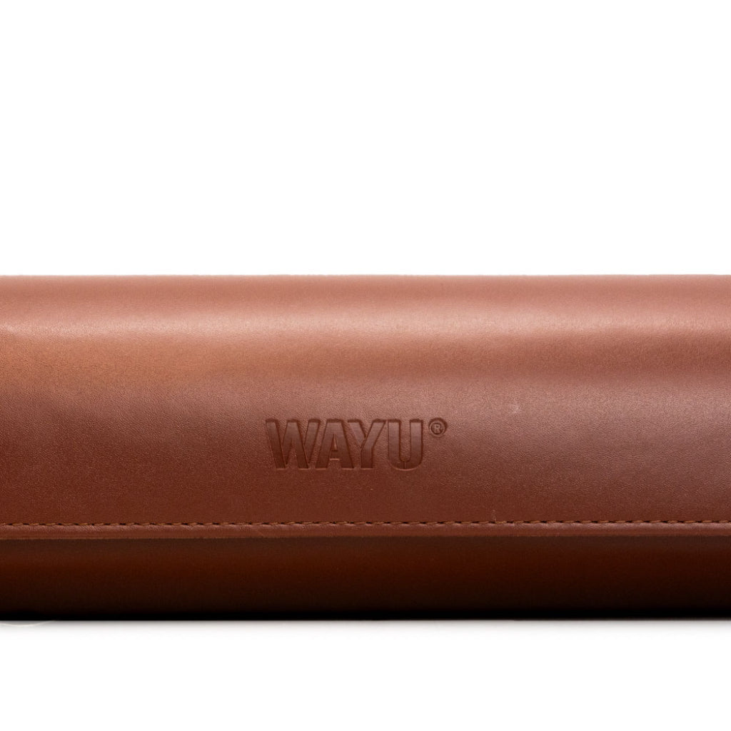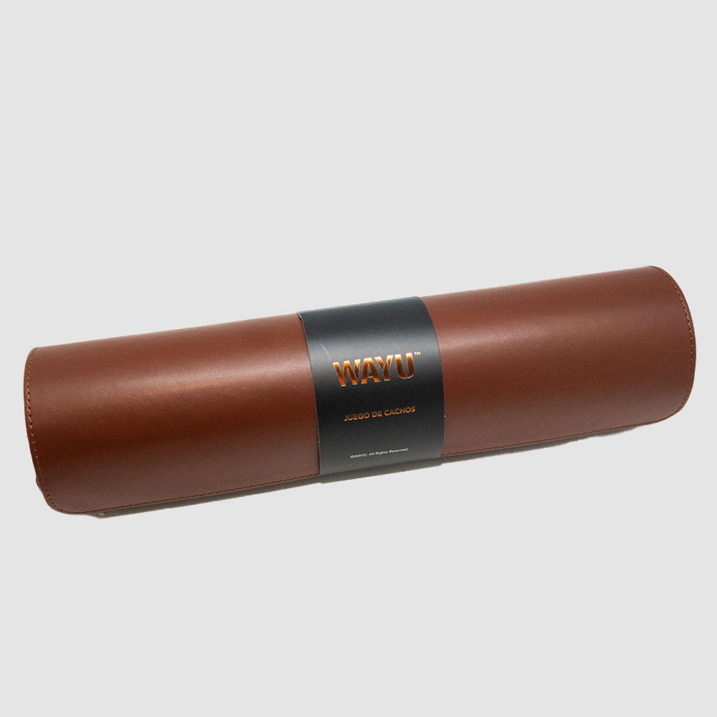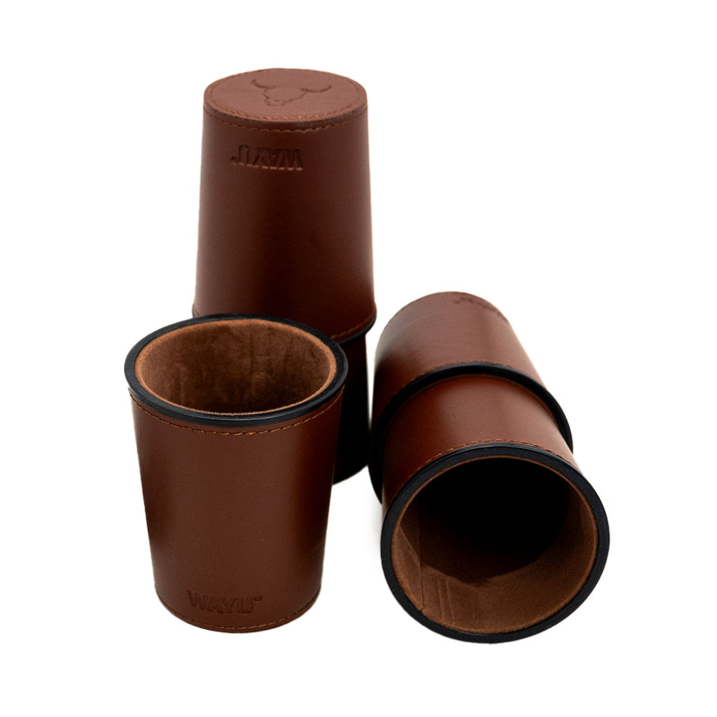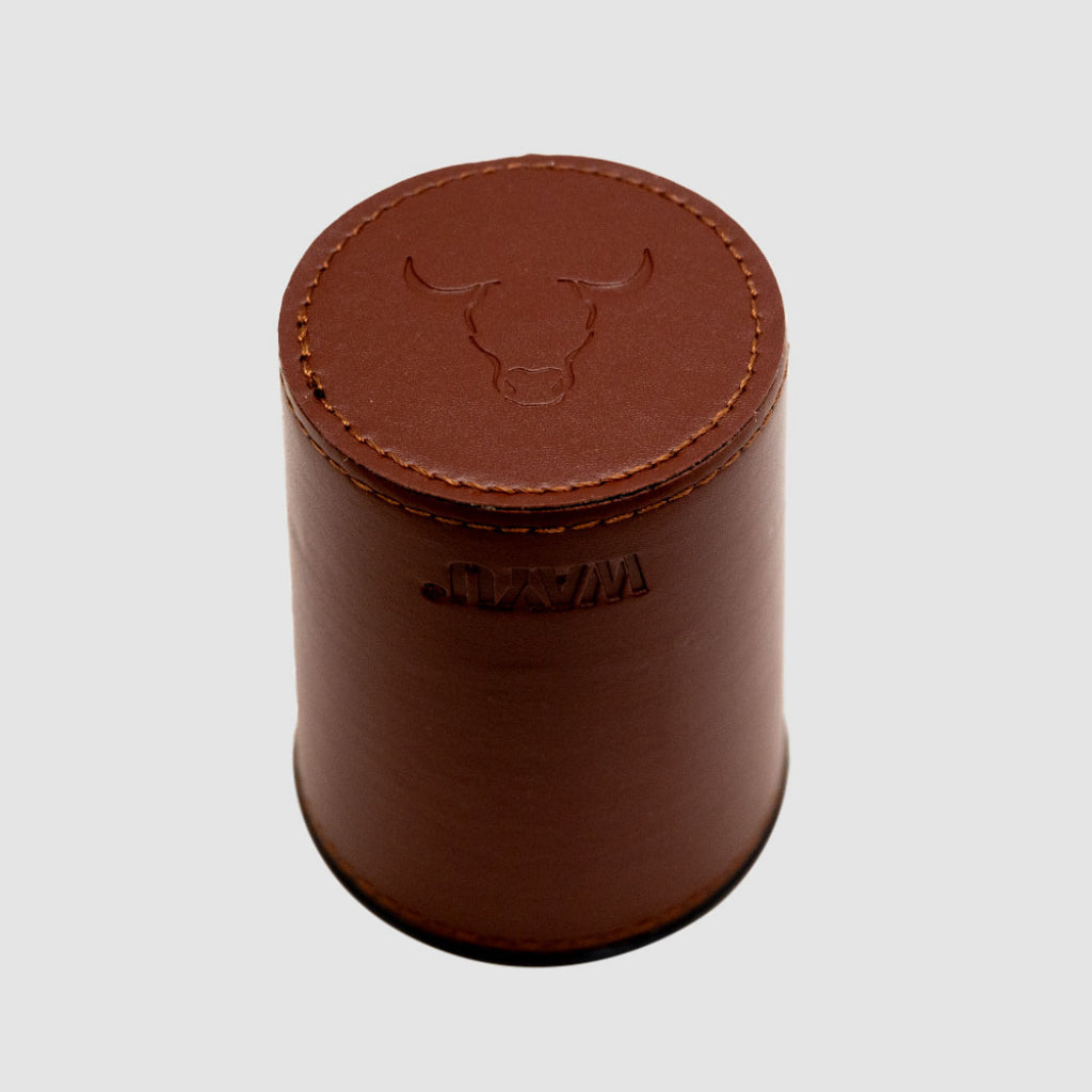 Cada cubilete está fabricado en cuero vegano café, con terminaciones suaves al tacto y el icónico toro WAYU grabado, aportando una estética sofisticada. Los dados, en color negro con puntos naranjos, le dan personalidad y un look moderno imposible de confundir. Todo el juego se guarda dentro de un estuche cilíndrico de cuero vegano, práctico y fácil de transportar.