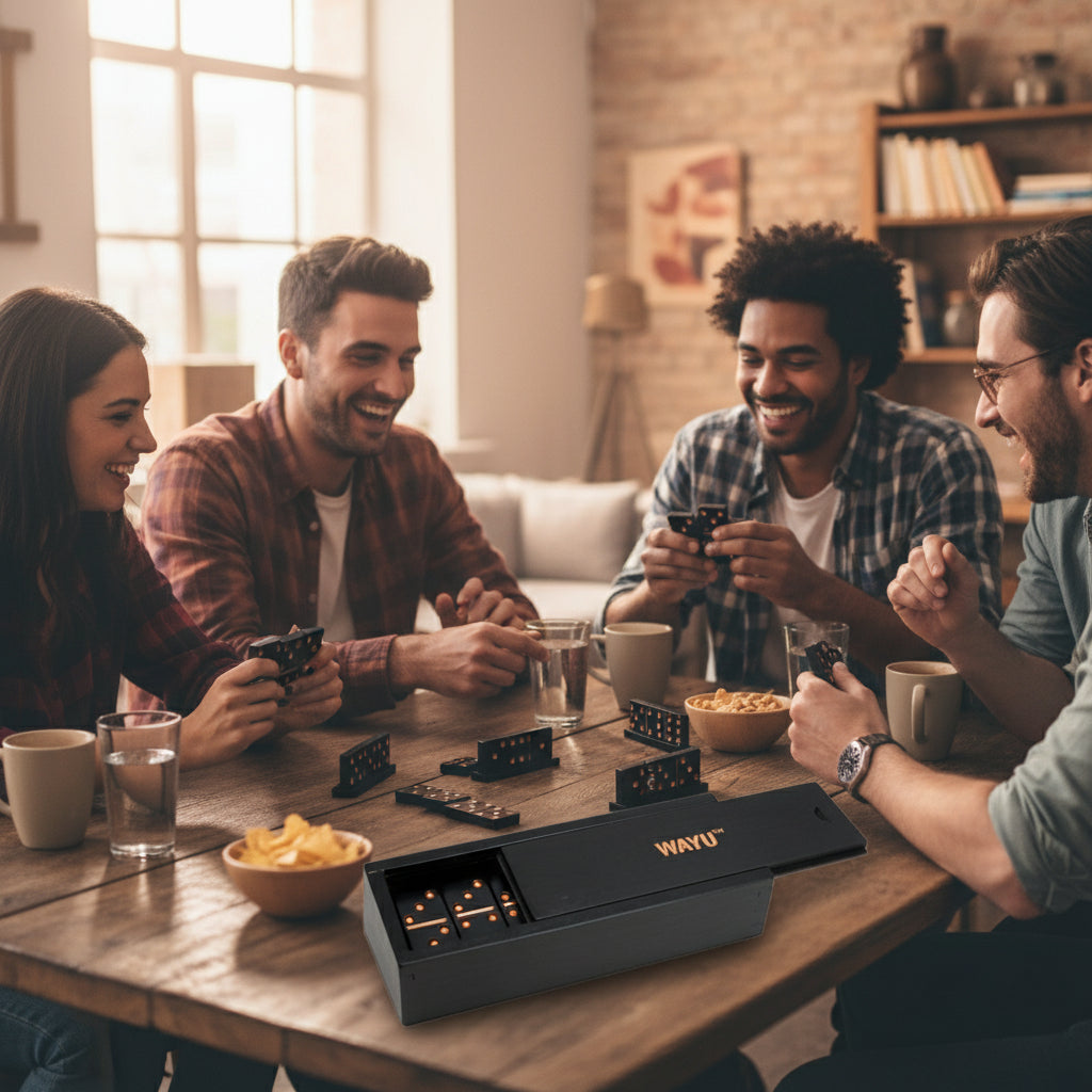 Redescubre el clásico dominó con un diseño elegante y resistente. Este set Wayu combina tradición y estilo moderno gracias a sus fichas en tono negro con puntos en relieve y una caja de madera robusta ideal para guardar y transportar fácilmente. Perfecto para tardes en familia, reuniones con amigos o para regalar a quienes disfrutan de los juegos de mesa con carácter.