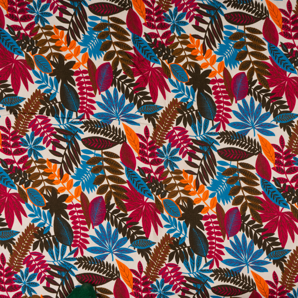 Diseño vibrante con estampado de hojas en tonos fucsia, azul y naranja.
