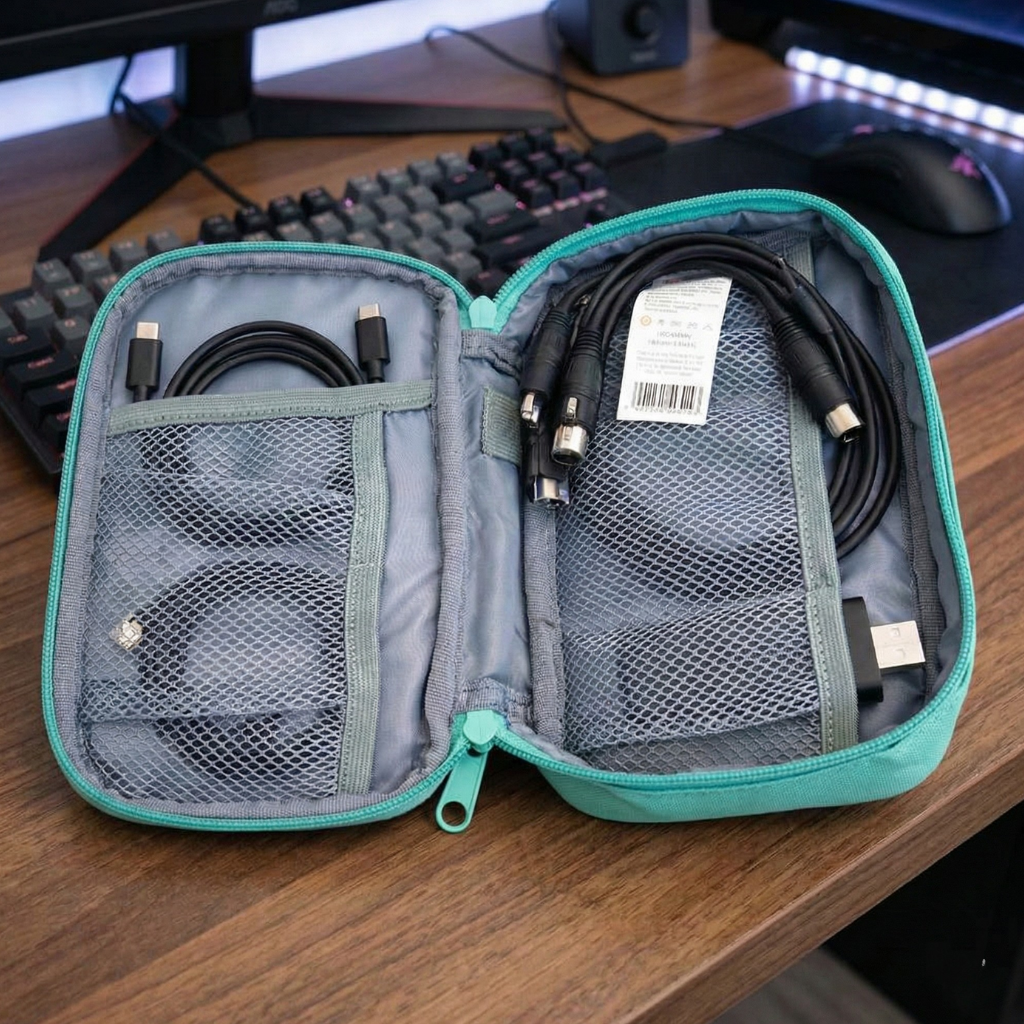 Permite guardar cables, cargadores y pequeños accesorios electrónicos de manera ordenada, evitando enredos y facilitando el acceso a tus dispositivos cuando los necesitas. Un accesorio funcional que ayuda a optimizar el espacio dentro de bolsos o mochilas.