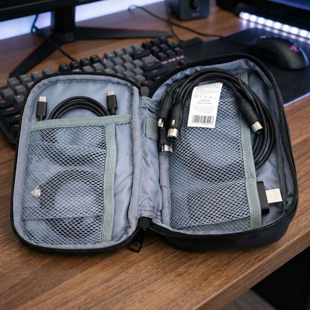Gracias a su diseño funcional, permite organizar cables, cargadores y pequeños accesorios electrónicos de forma eficiente, optimizando el espacio dentro de bolsos o mochilas. Es un accesorio práctico para quienes buscan mantener el orden sin sacrificar portabilidad.