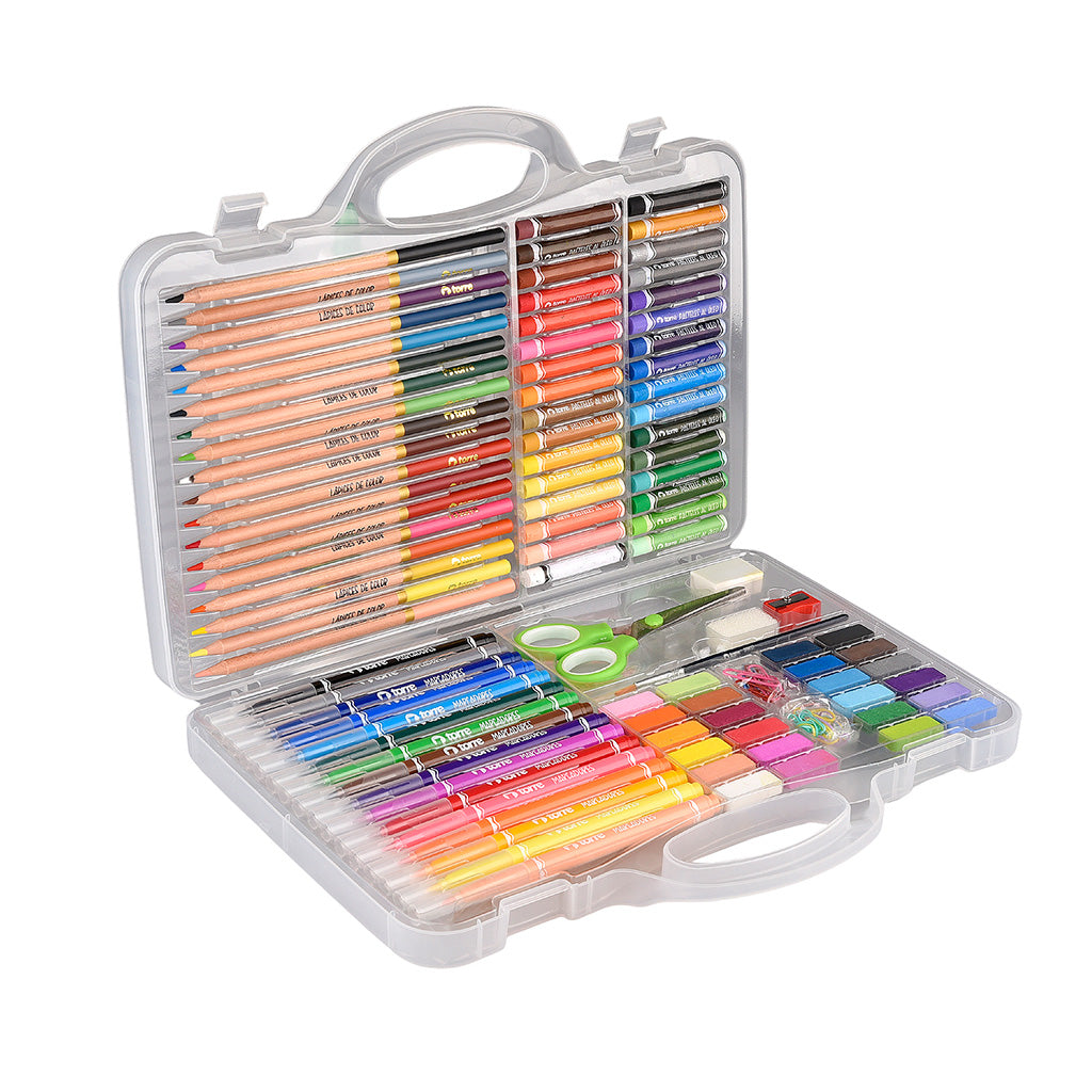 Incluye un surtido diverso de herramientas como marcadores, lápices pasteles, lápices de colores y acuarelas, además de accesorios esenciales que facilitan el proceso creativo y el orden del material. Una opción práctica y versátil para desarrollar proyectos artísticos, practicar técnicas y disfrutar del arte de manera libre y entretenida.