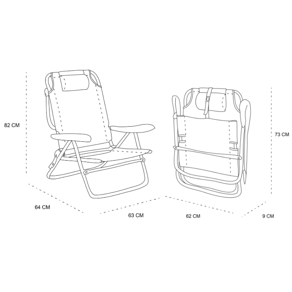 Características Especiales: 5 posiciones hasta el horizontal, plegado con mangos de mochila, bolsillo con cierre para pertenencias, marco para colgar toalla, almohada para mayor comodidad