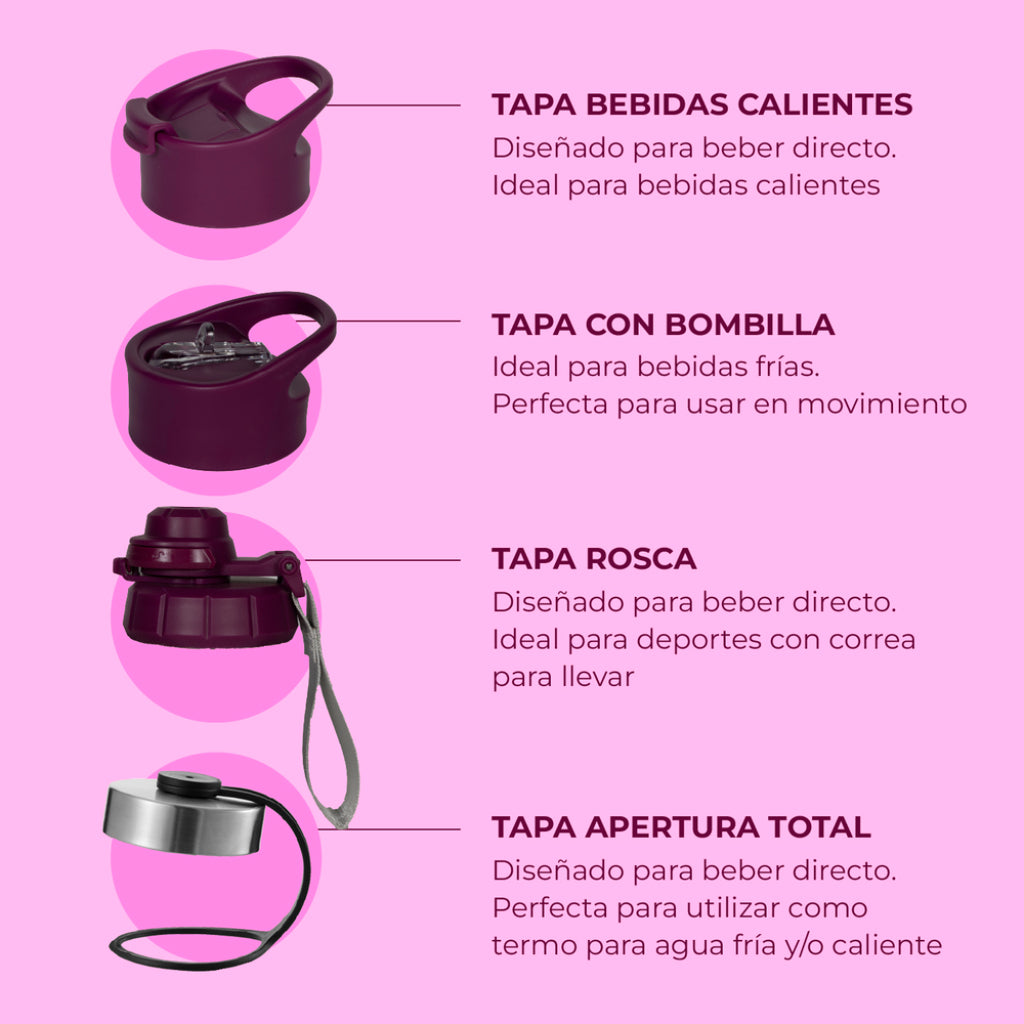 Termo Botella Agua Termica Buffer Morea Acero Inoxidable +4 Tapas Dani Pink