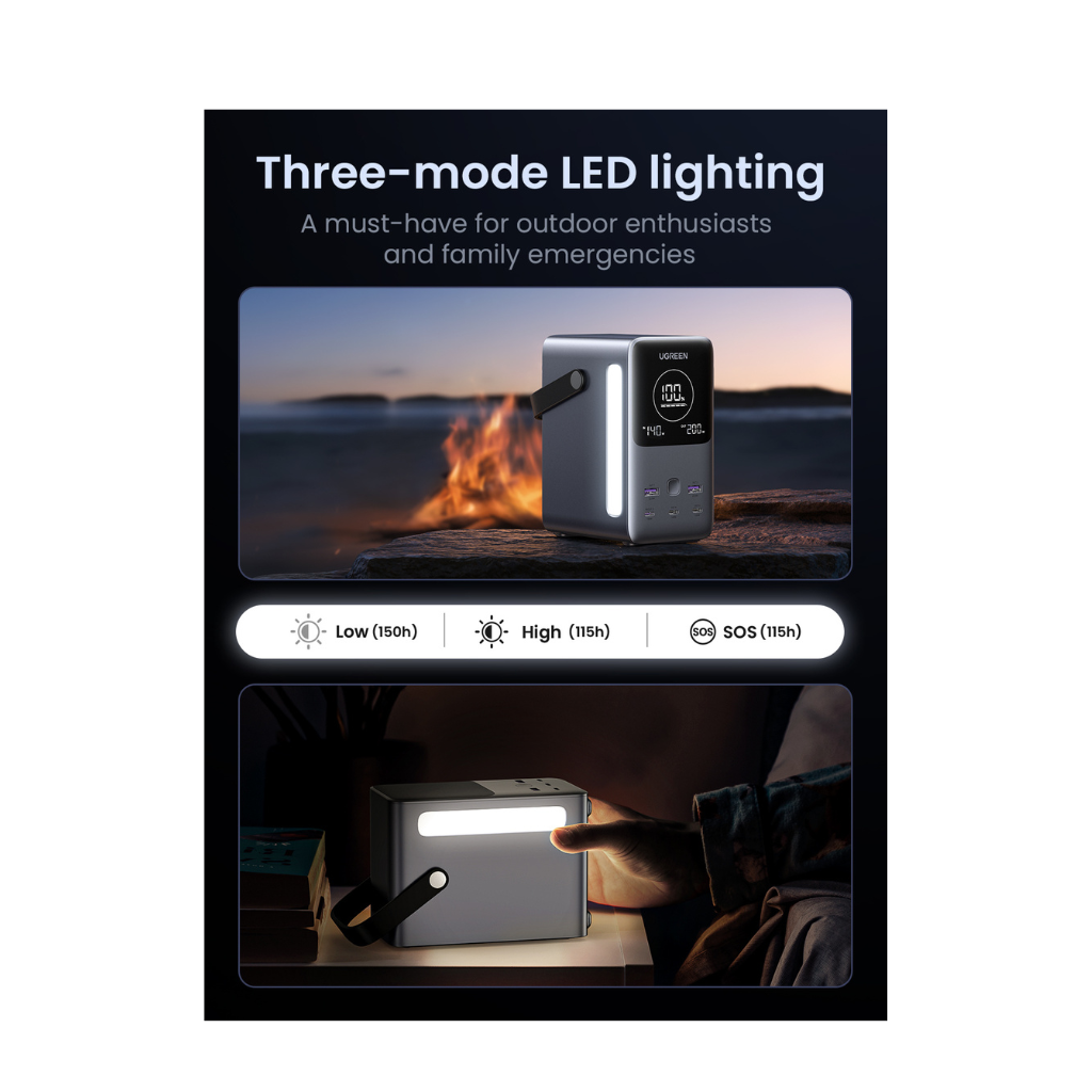 La Ultra Batería Portátil UGREEN PB720 de 48.000mAh está diseñada para quienes necesitan potencia extrema y autonomía real en cualquier entorno. Con una salida máxima de 300W, es capaz de alimentar laptops, tablets, smartphones, cámaras y múltiples dispositivos de alto consumo al mismo tiempo. Su capacidad superior la convierte en la elección ideal para viajes largos, trabajo remoto, campamentos o jornadas intensas donde no puedes depender de un enchufe.